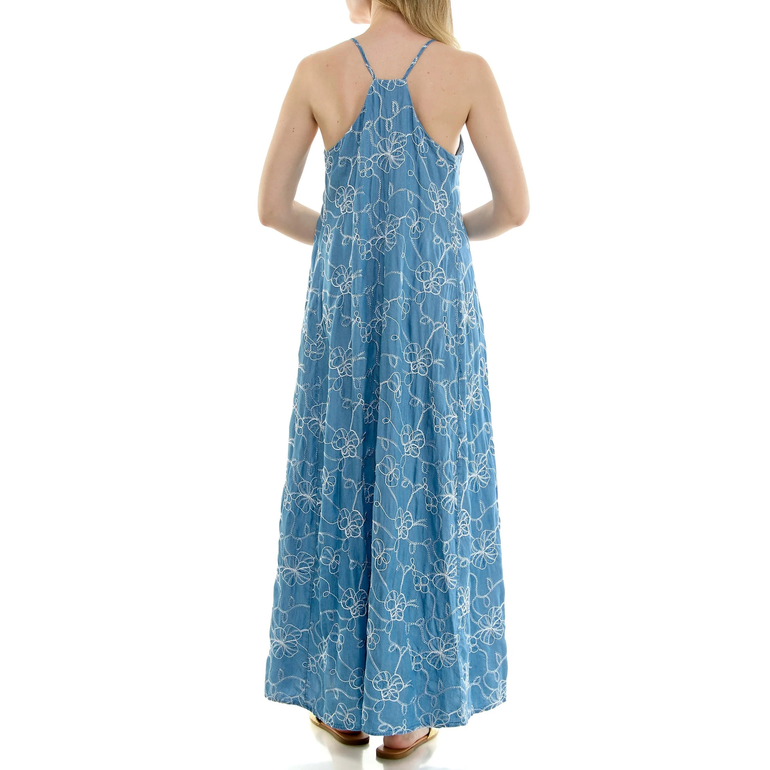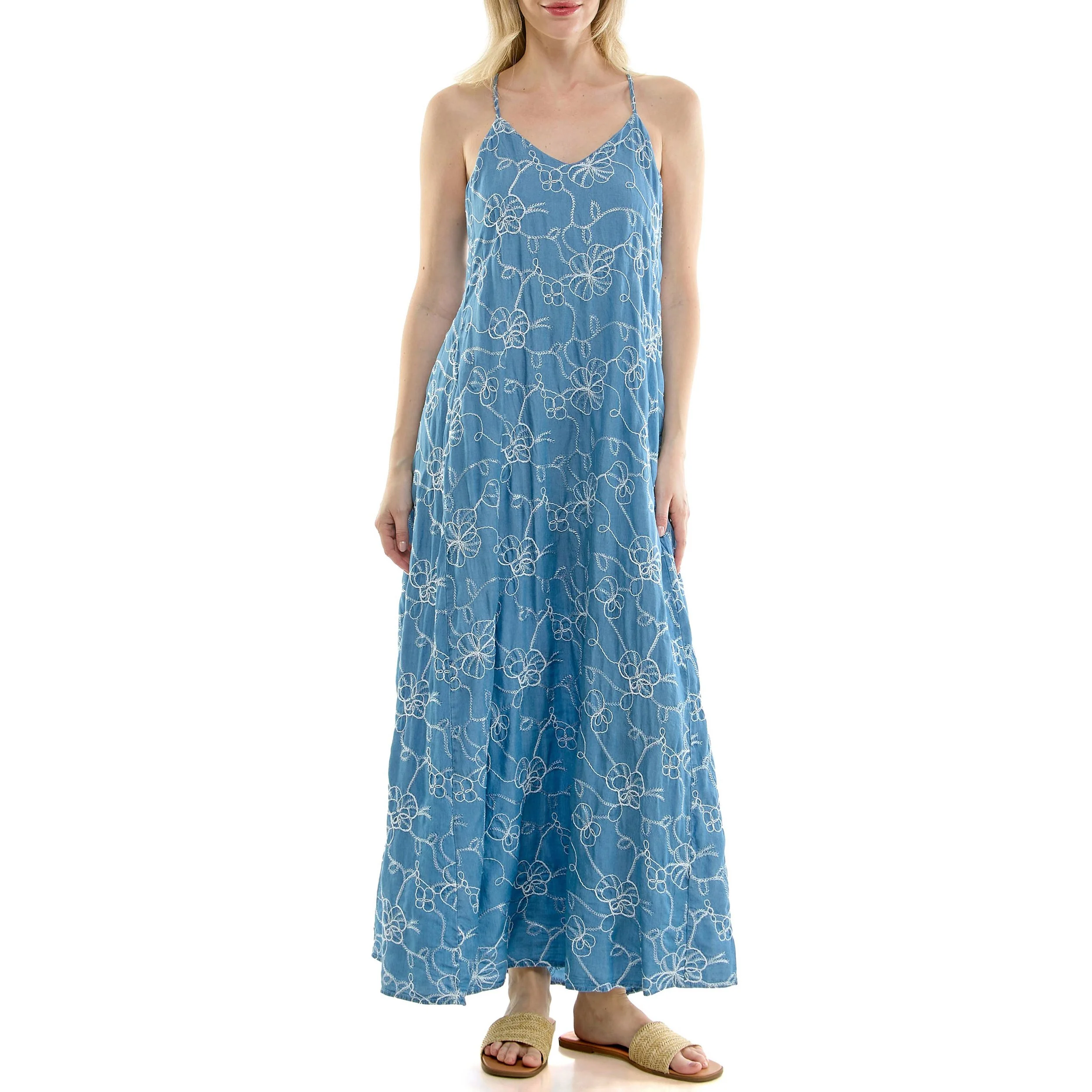 Swirly embroidered flowers bring sunny-day charm to this flowy maxi dress framed by a sporty racerback and handy side pockets.
