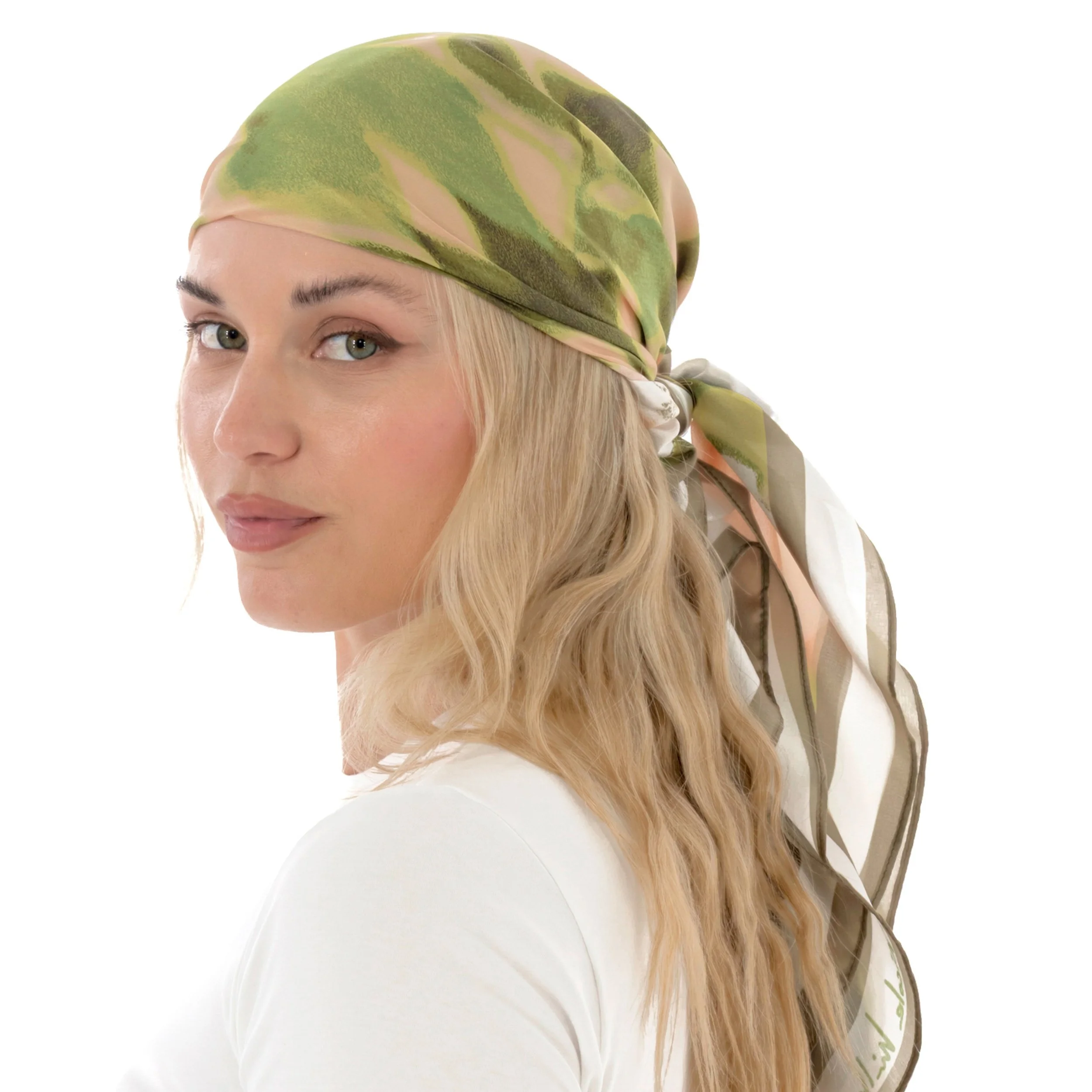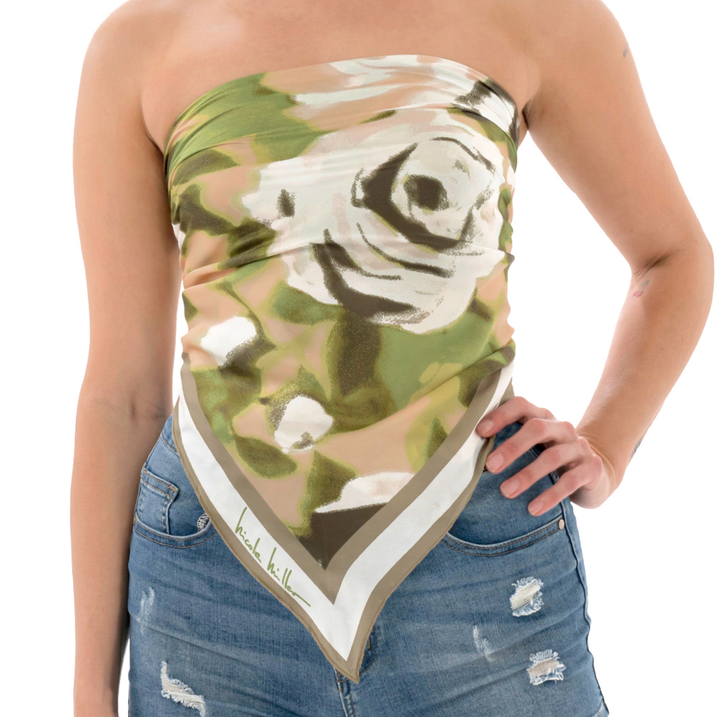A lightweight floral scarf shifts effortlessly from neck tie to top to headscarf in a stylish snap.