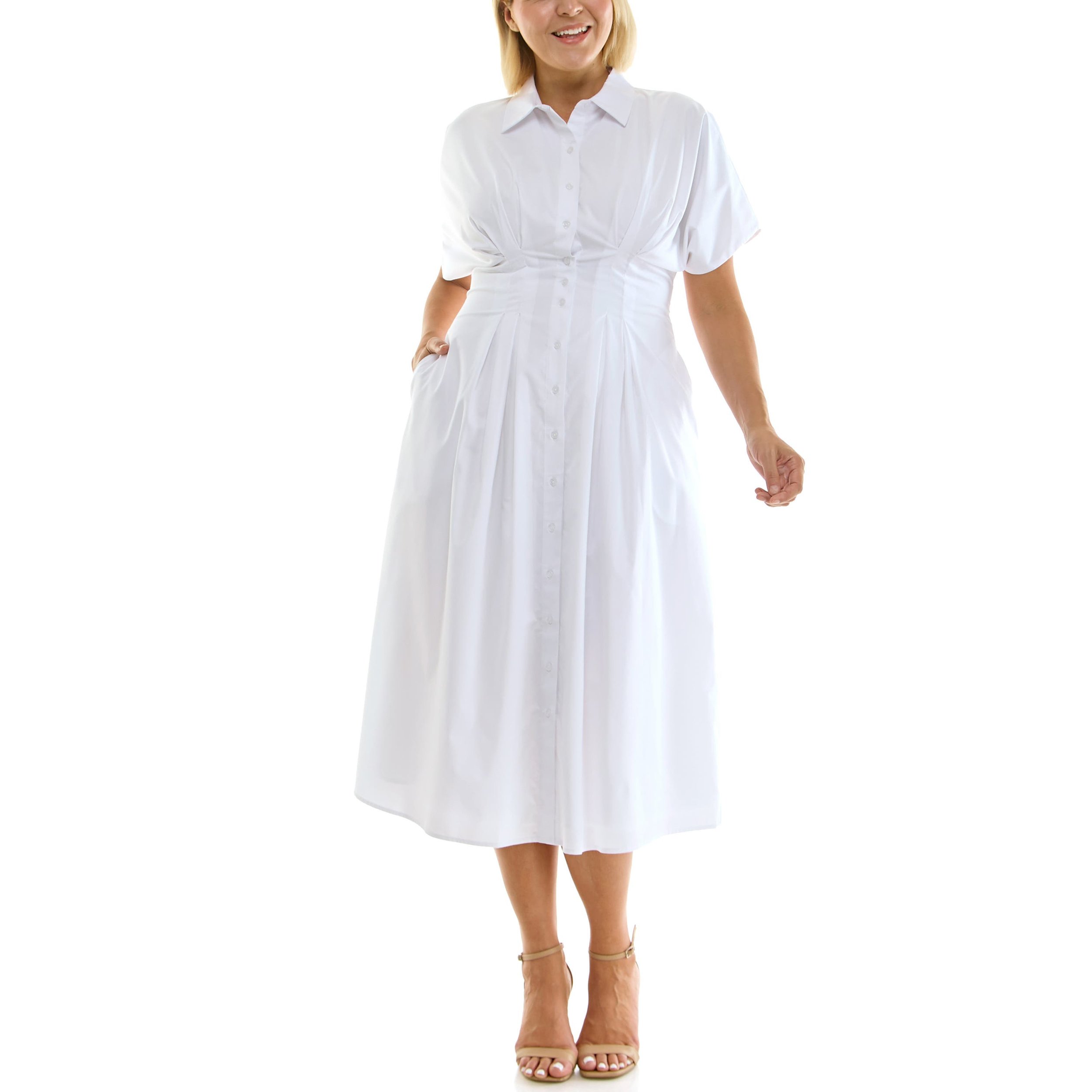 Look posh and refined for workdays or special occasions in this stretch-enhanced shirtdress in a swirl of brilliant white.