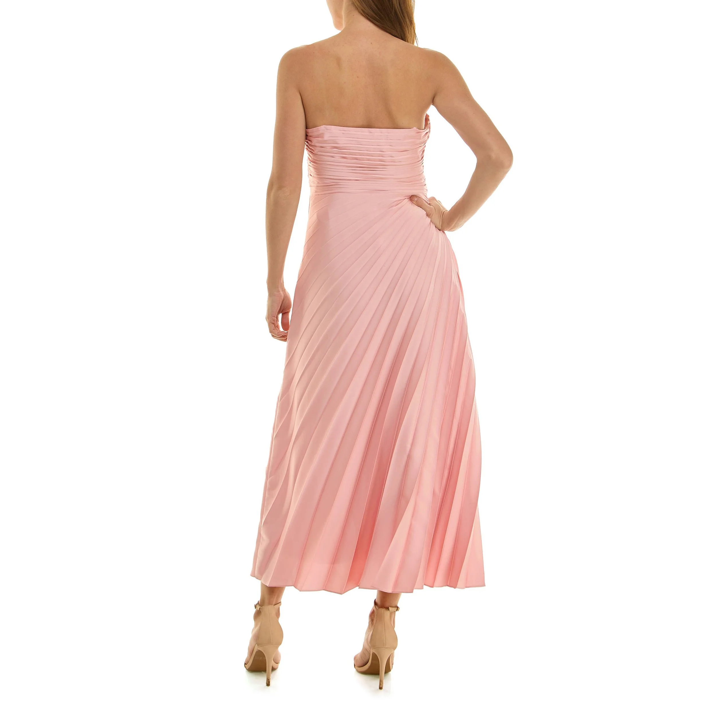 A strapless silhouette enhances the romantic charm of this elegant A-line dress cut from smooth satin with asymmetric pleats.