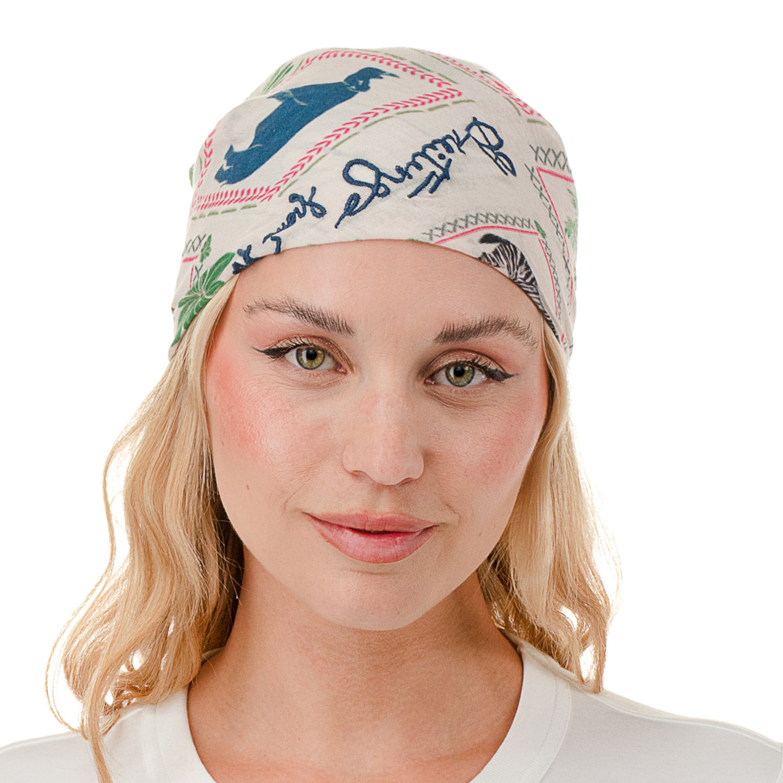 A lightweight safari-inspired bandana shifts effortlessly from neck tie to headscarf in a stylish snap.