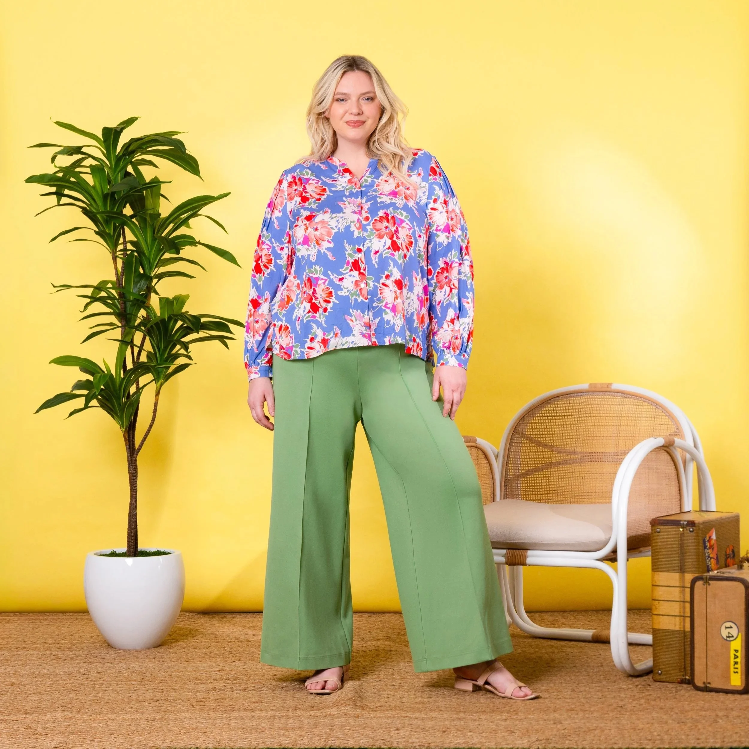 Features: V-neck, button-front, long blouson sleeves with pleat detail, back yoke with center back gathering, bust darts